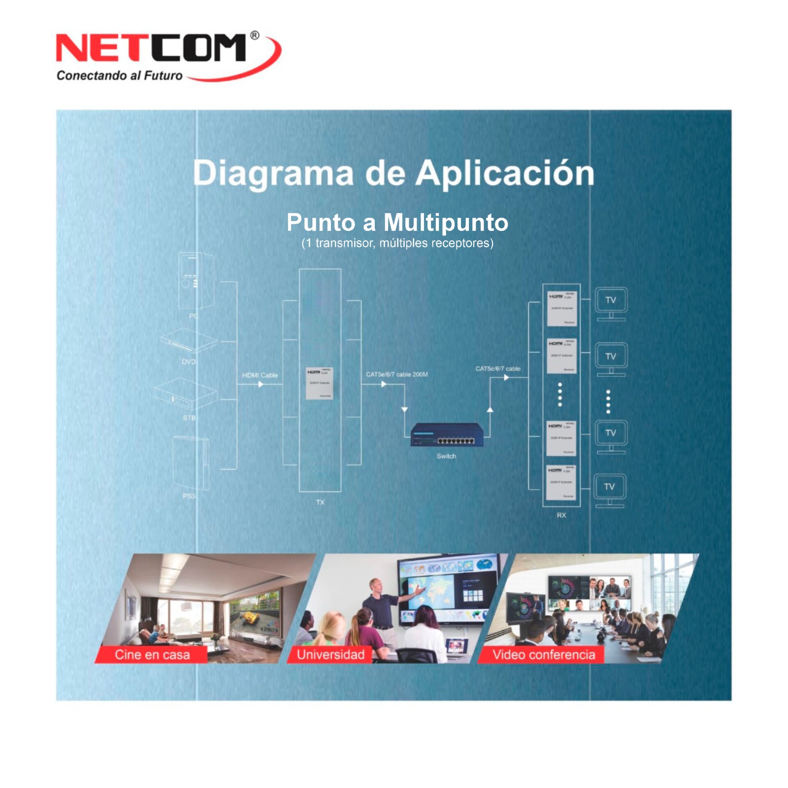 Longitud del cable CAT6/CAT7 entre Rx y TX: 200 metros