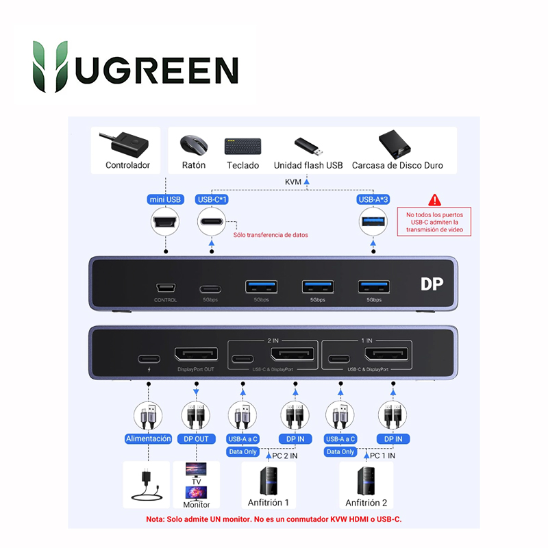 - [ Consejos ] 1. Conecte 2 cables USB A-C para la alimentación. 2. No incluye cables de alimentación USB-C ni adaptador de alimentación. 3. Para evitar incompatibilidades, no utilizar con docking station. 4. Contenido del paquete: 1*switch KVM DP, 2*cables USB A-C, 2*cables DP, 1*controlador de escritorio, 1*manual.