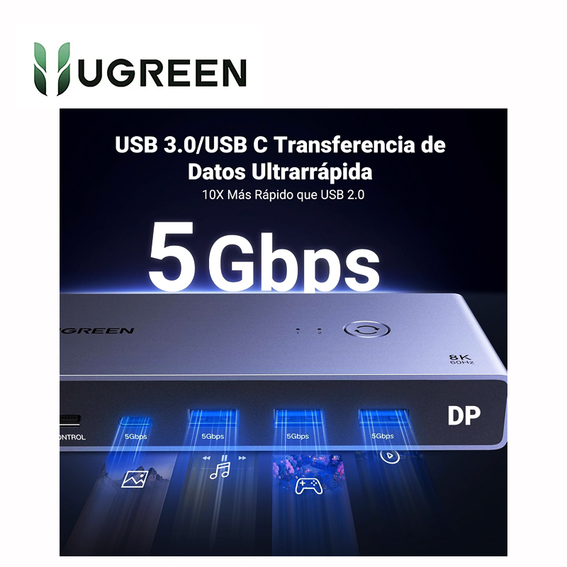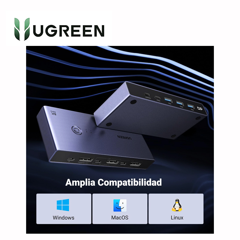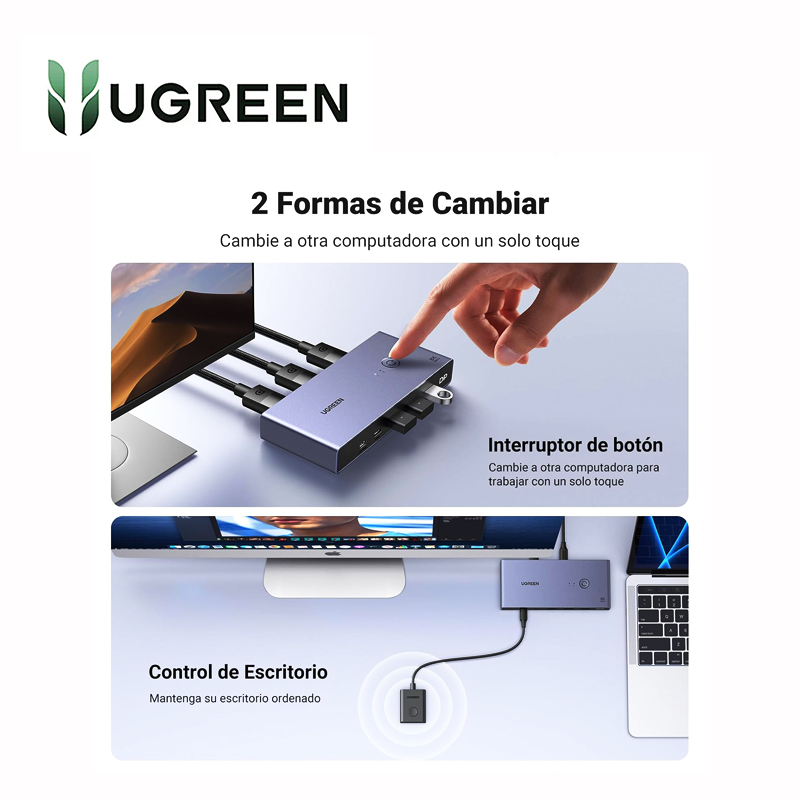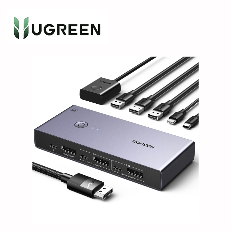 UGREEN Switch KVM Displayport 8K 60Hz 2 Entradas 1 Salida 1.4 4K 240Hz 1 Puerto Tipo C 3 Puertos USB A para Teclado Ratón Disco Duro Impresora Monitor con Controlador y 2 Cables DP 1M