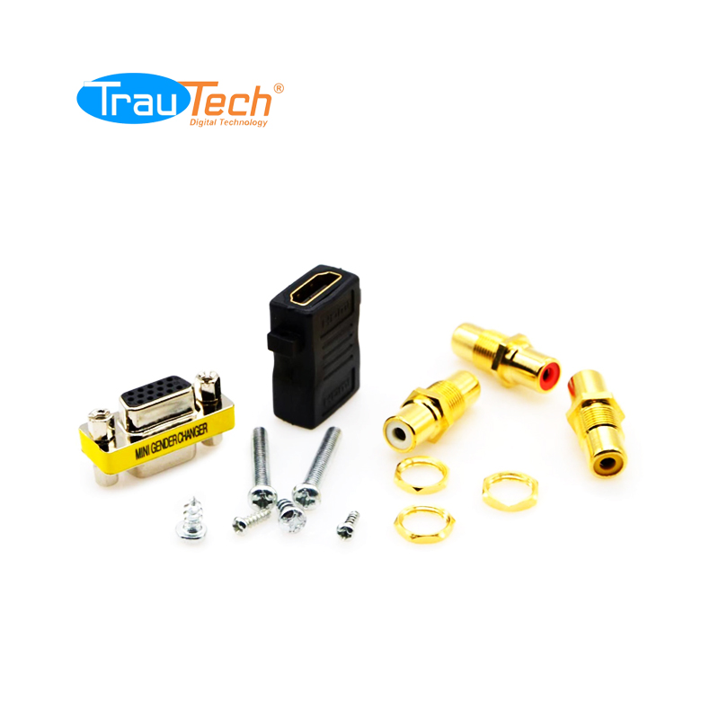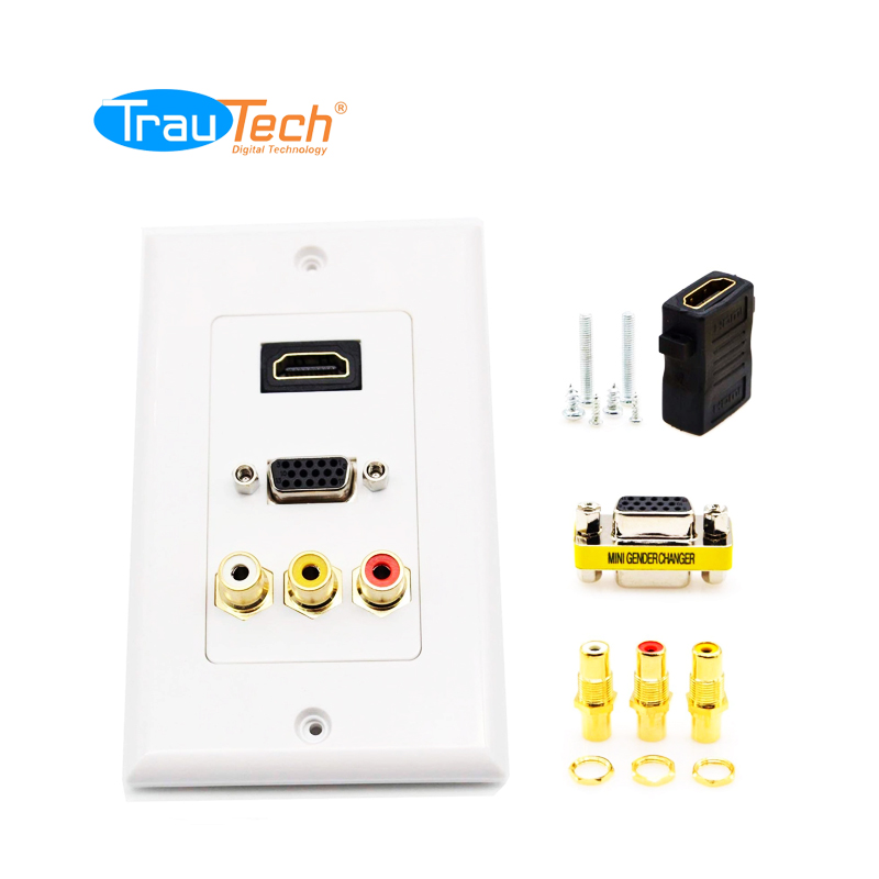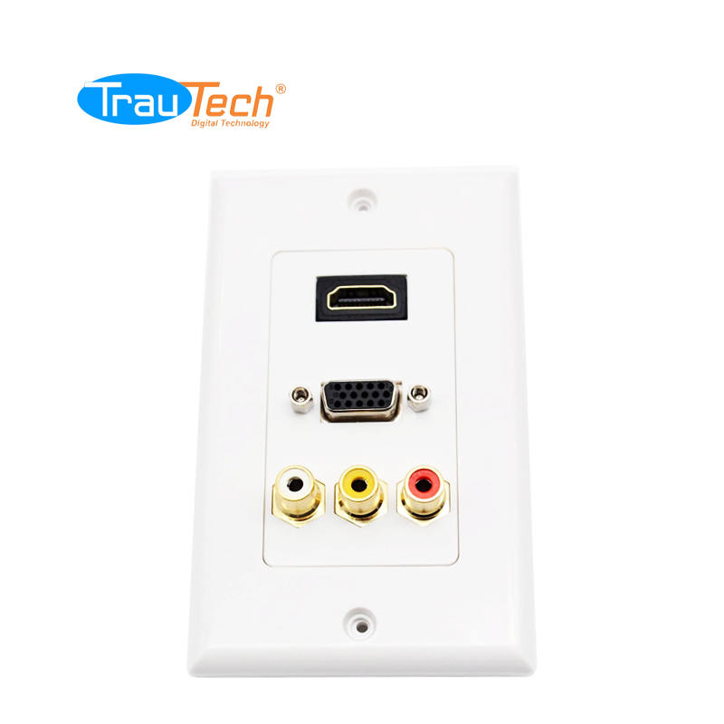 FACE PLATE PLACA DE PLASTICO DE 1 HDMI 2.0 ULTRA HD 4K 60HZ/ 1 PUERTO VGA 15 PINES Y 3 PUERTOS RCA ROJO BLANCO Y AMARILLO TRAUTECH