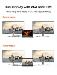 El concentrador USB C con puerto VGA y HDMI puede extender fácilmente o espejo a doble pantalla. Pero en el modo extendido, el VGA y HDMI muestran el mismo contenido pero diferente en el portátil de origen. La resolución máxima es de 1080p cuando los puertos VGA y HDMI se utilizan simultáneamente.