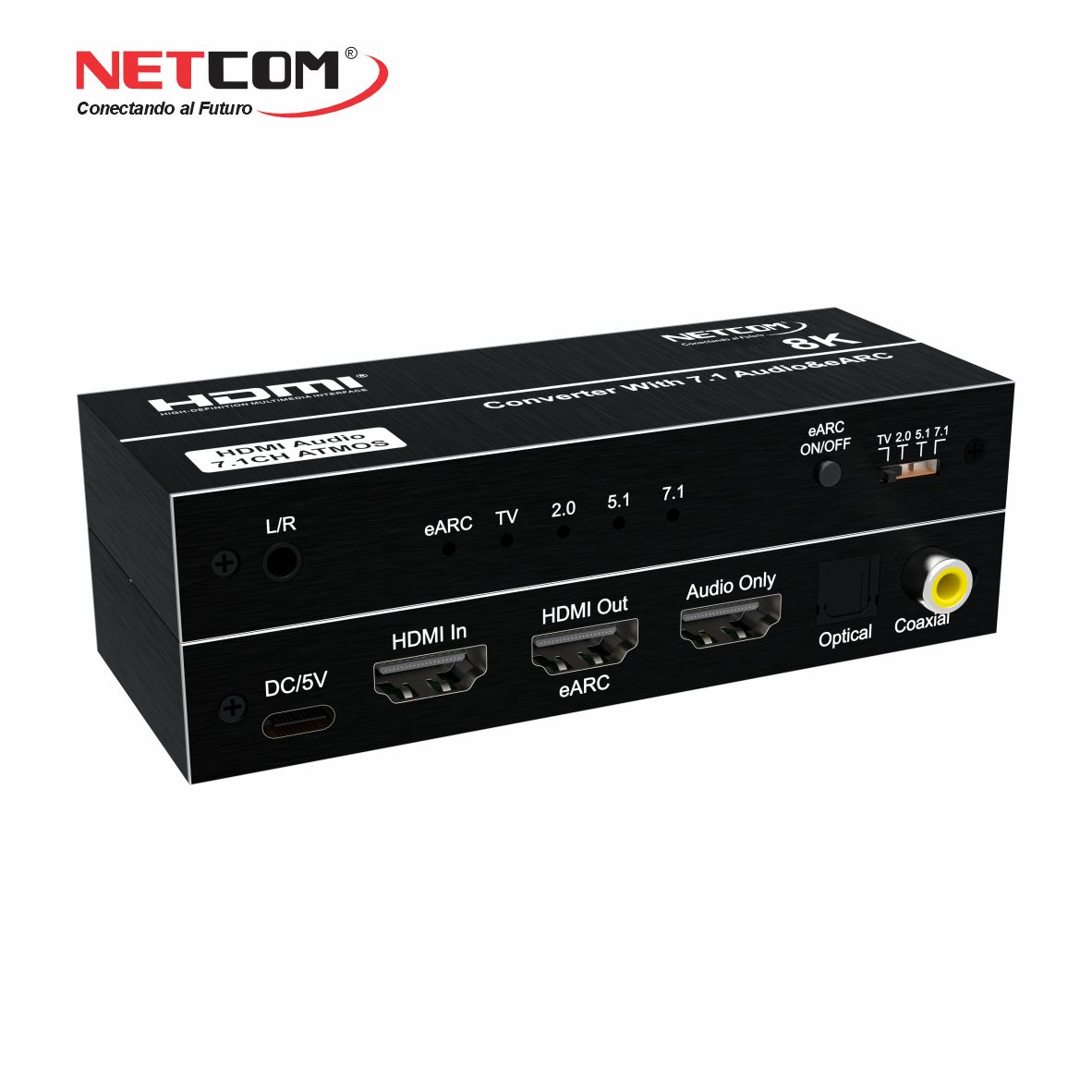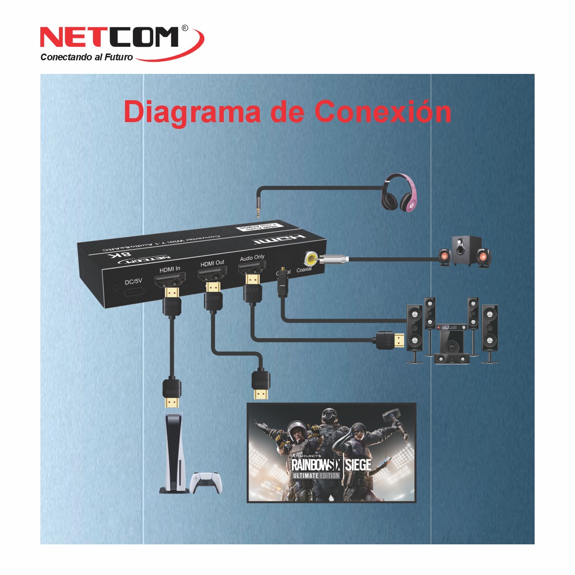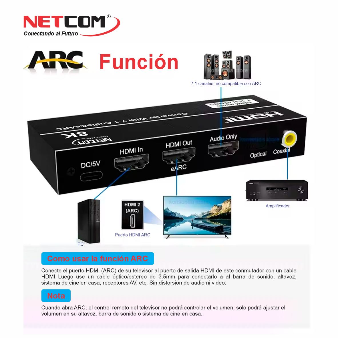 Este divisor u extractor de audio se puede conectar entre el dispositivo fuente (reproductor de DVD, reproductor de Blu-ray, reproductor de red, decodificador, PS2, PS3, PS4, PS5, Xbox360, PC, etc.) y el dispositivo de visualización (TV, HD monitor, proyector), puede separar sincrónicamente una señal de fibra óptica y conectar un canal estéreo al sistema de sonido para obtener señales de audio de alta calidad. También admite la función de extracción de audio. AUDIO OUT HDMI compatible con eARC (canal de Retorno de Audio mejorado) y todos los formatos de TV 3D además de todos los formatos HDTV de hasta 8K@60Hz,4K x 2K @ 144Hz RGB 4:4:4, 8/10/12 bit color profundo y los formatos de audio como AC-3, DTS, LPCM.
