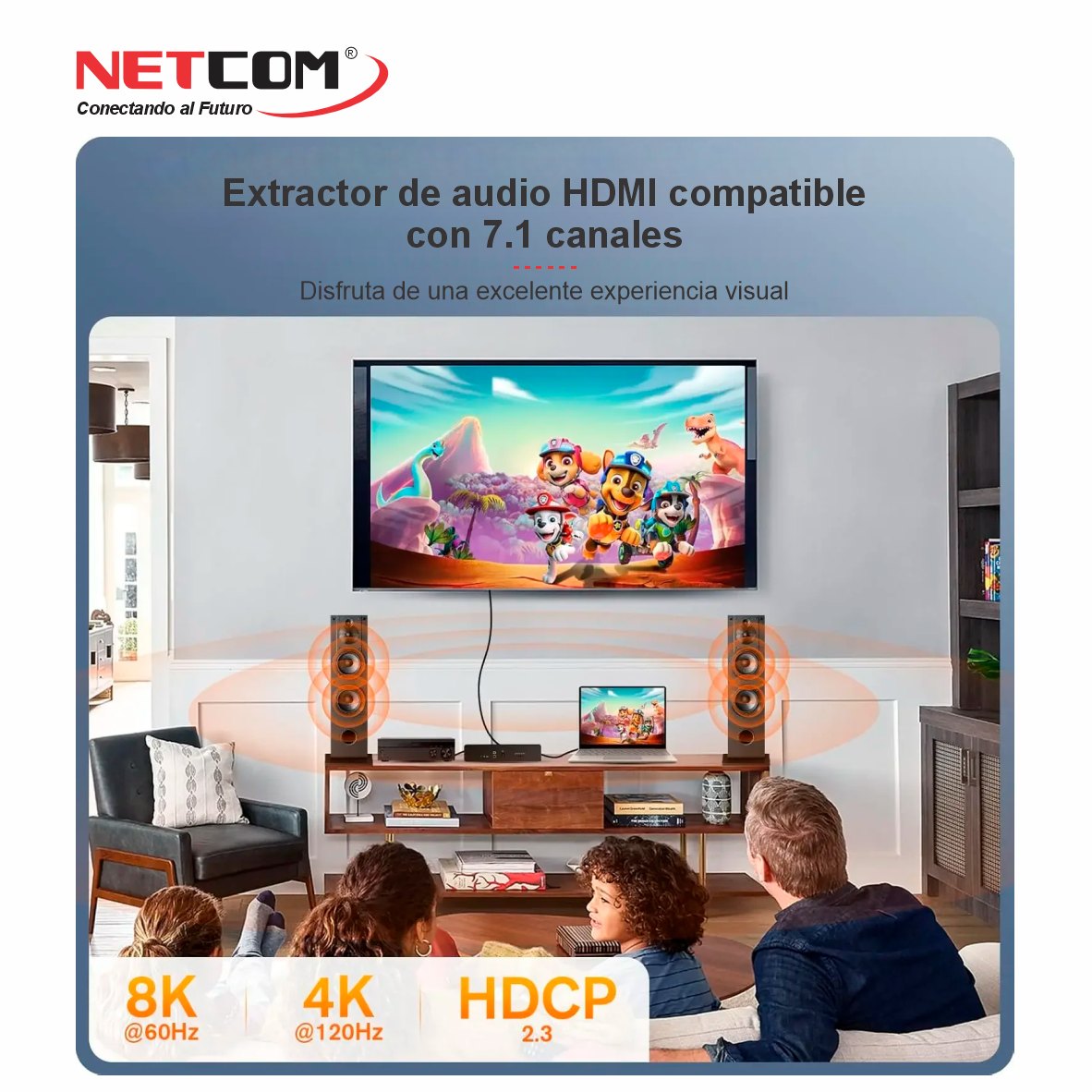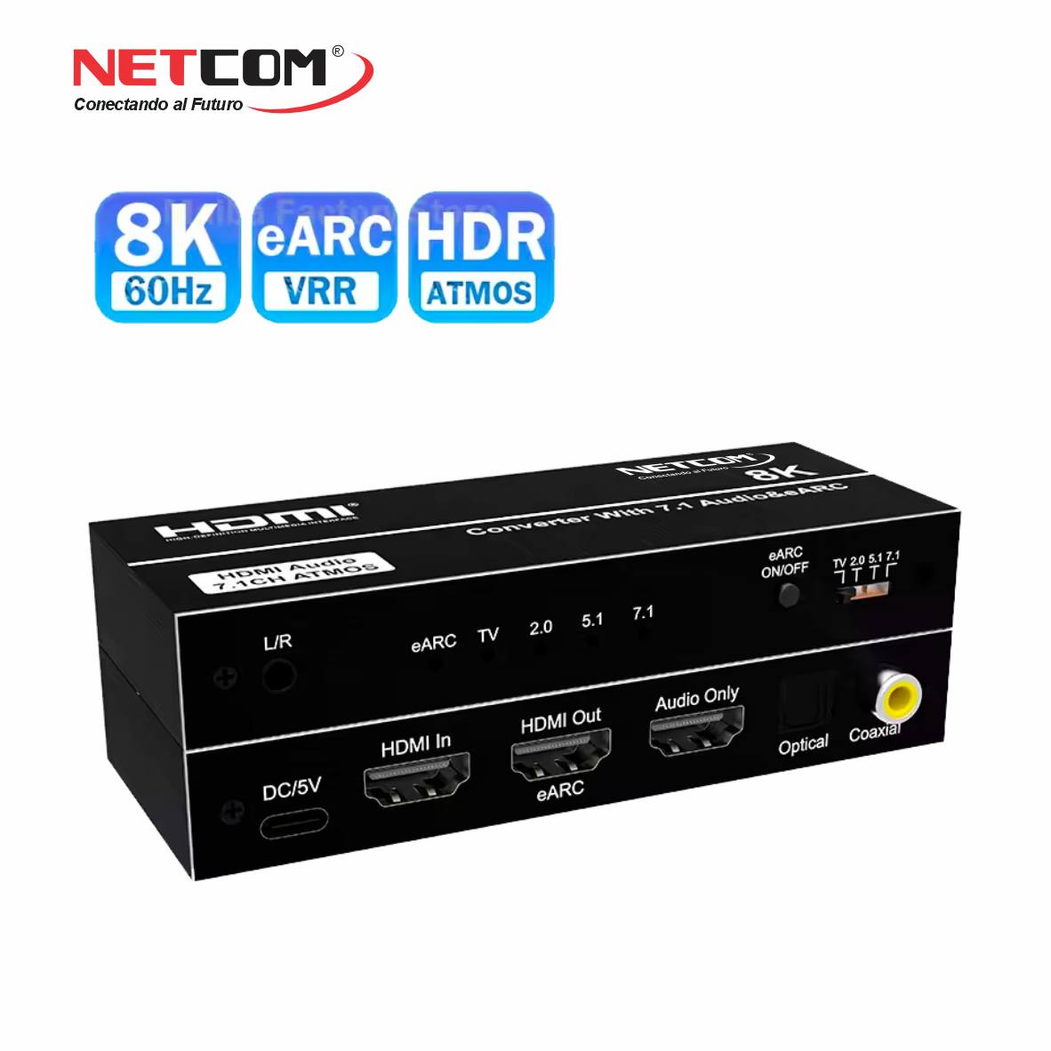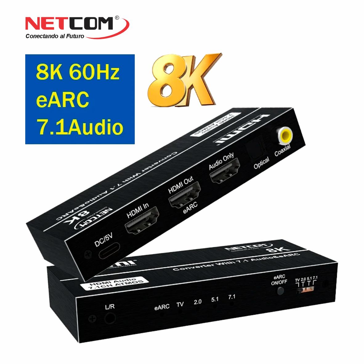 Este divisor u extractor de audio se puede conectar entre el dispositivo fuente (reproductor de DVD, reproductor de Blu-ray, reproductor de red, decodificador, PS2, PS3, PS4, PS5, Xbox360, PC, etc.) y el dispositivo de visualización (TV, HD monitor, proyector), puede separar sincrónicamente una señal de fibra óptica y conectar un canal estéreo al sistema de sonido para obtener señales de audio de alta calidad. También admite la función de extracción de audio. AUDIO OUT HDMI compatible con eARC (canal de Retorno de Audio mejorado) y todos los formatos de TV 3D además de todos los formatos HDTV de hasta 8K@60Hz,4K x 2K @ 144Hz RGB 4:4:4, 8/10/12 bit color profundo y los formatos de audio como AC-3, DTS, LPCM.