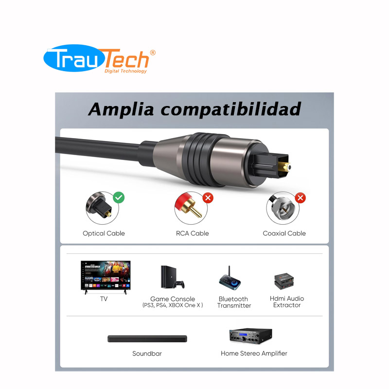 Perfecto para audio PCM sin comprimir, sistemas de sonido envolvente comprimido 5.1 a 7.1, incluyendo Dolby Digital Plus, DTS-HD de alta resolución y LPCM, este cable de audio digital es ideal para Samsung, Vizio, LG, Sony, Bose, Xbox, PS4, etc. (Barra de sonido, TV o PlayStation con un puerto Toslink/óptico)