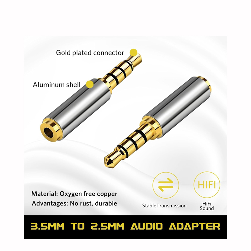- Adaptador de enchufe de 3 anillos de 4 polos: 3.5 mm macho a 2.5 mm hembra/2.5 mm macho a 3.5 mm hembra adopta un proceso de galvanoplaa, carcasa de aluminio, antiarañazos, más duradero, resistencia a la corrosión antioxidante. La interfaz chapada en oro asegura reducir eficazmente la pérdida de señal.