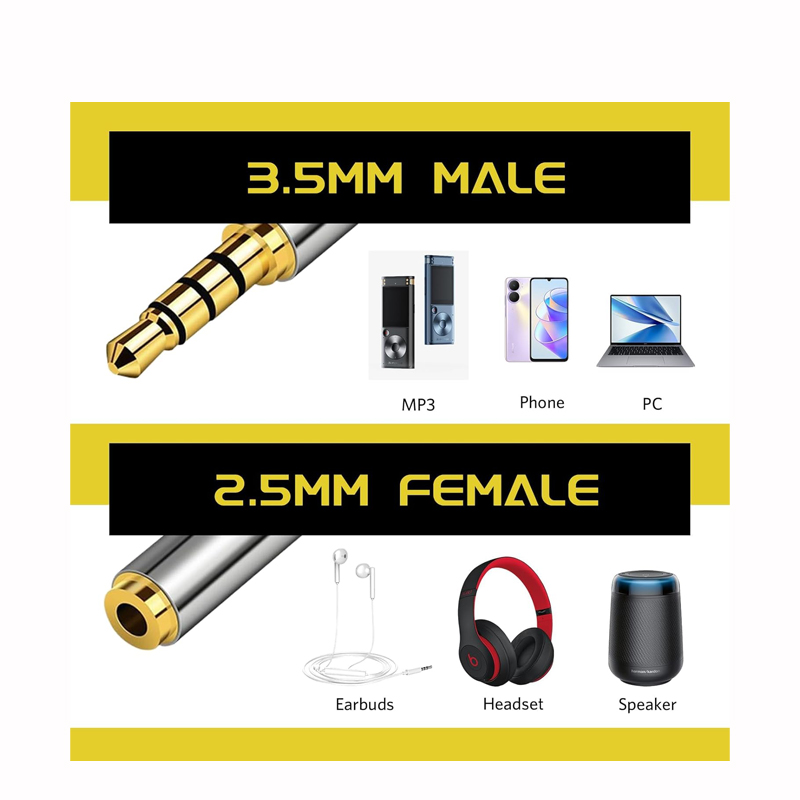 - Aplicación: conecta tu iPhone, iPod, reproductor de MP3, reproductor de CD, smartphone, tableta o cualquier dispositivo de audio con un conector de auriculares de 3.5 mm/2.5 mm a tus auriculares con micrófono. Funciona pliamente con auriculares, equipos de audio doméstico, amplificadores, consola de mezcla, dispositivos de cine en casa o receptores AV.