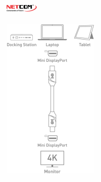 El cable mDP soporta altas resoluciones de hasta 4k x 2k (3840 x 2160) a 60Hz con un ancho de banda HBR2 máximo de 21,6 Gbps. El cable también es compatible con Multi-Stream (MST) para la conexión en cadena de varios monitores y proporciona soporte de audio opcional.