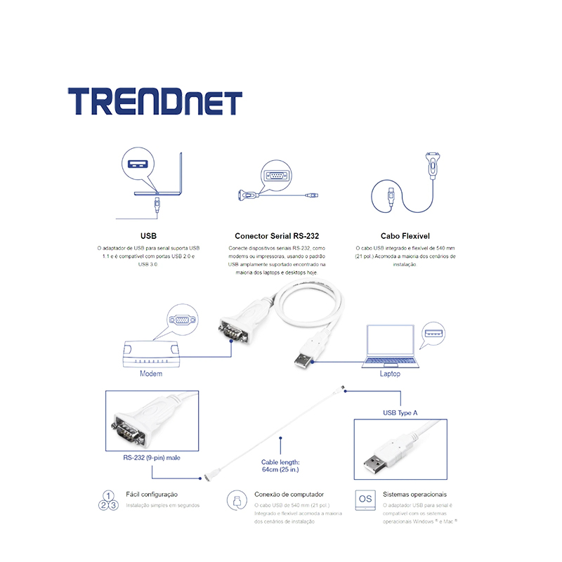 El convertidor USB a serie de TRENDnet, permite a los usuarios conectar cómodamente un dispositivo serie RS-232, como un módem o una impresora, a un puerto USB de su PC de escritorio o portátil. El adaptador USB a serie admite los sistemas operativos Windows® y Mac® . Los cables integrados brindan flexibilidad de configuración y se adaptan a la mayoría de los escenarios de instalación.