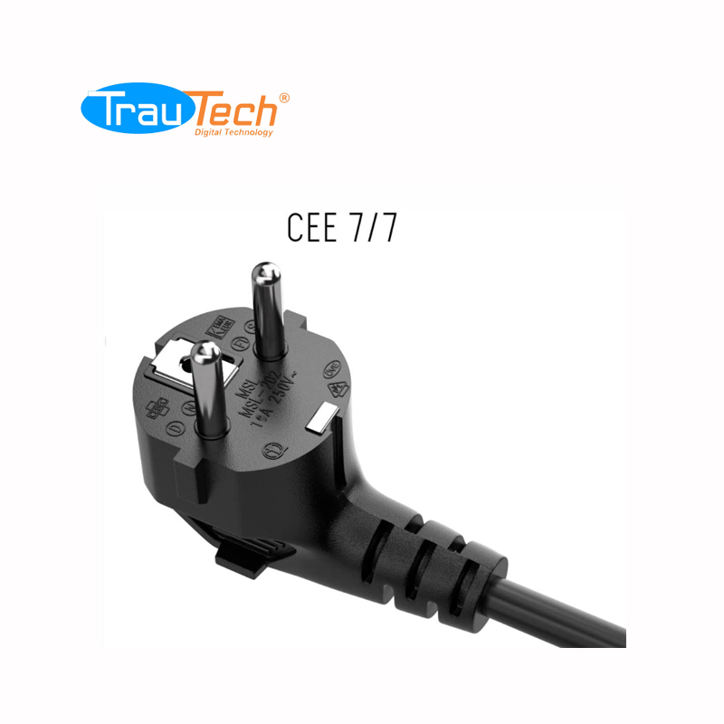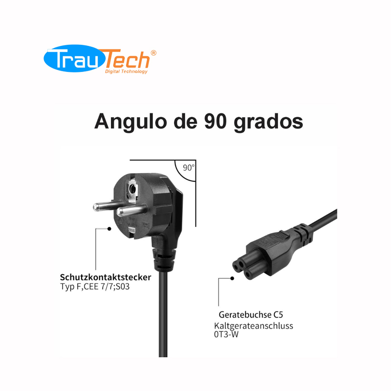 Este cable de alimentación de 18AWG (0,75 mm²) con un enchufe Schuko CEE 7/7 de la UE y un conector C5 IEC 320 es adecuado para bloques de alimentación con una entrada C6 | 250V a 2,5A-10A. Cable de conexión en ángulo, proteja el conector de contacto y el enchufe en un ángulo de 90° para evitar arrugas y daños causados por la carga y facilitar la conexión de dispositivos que se instalan directamente delante de la pared.