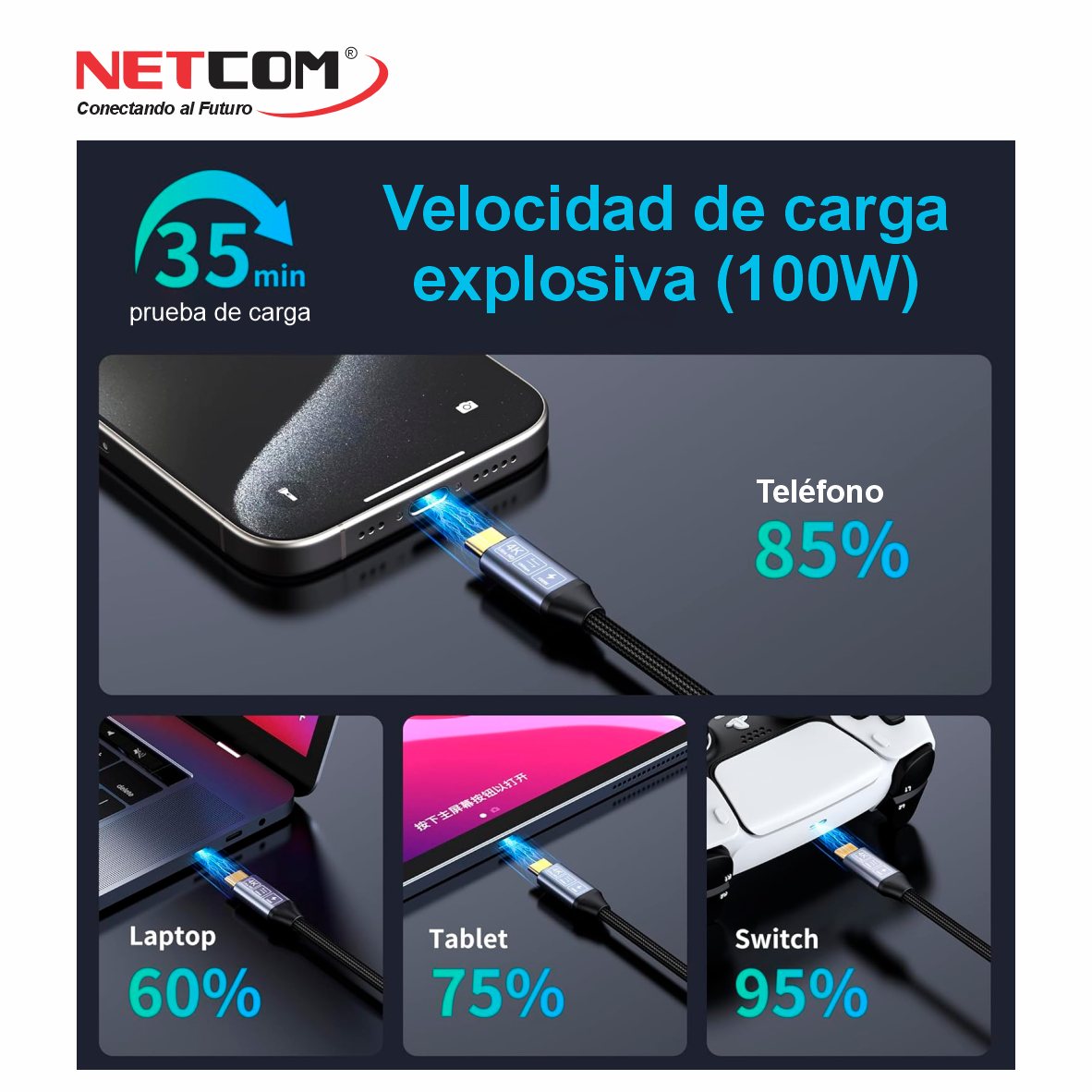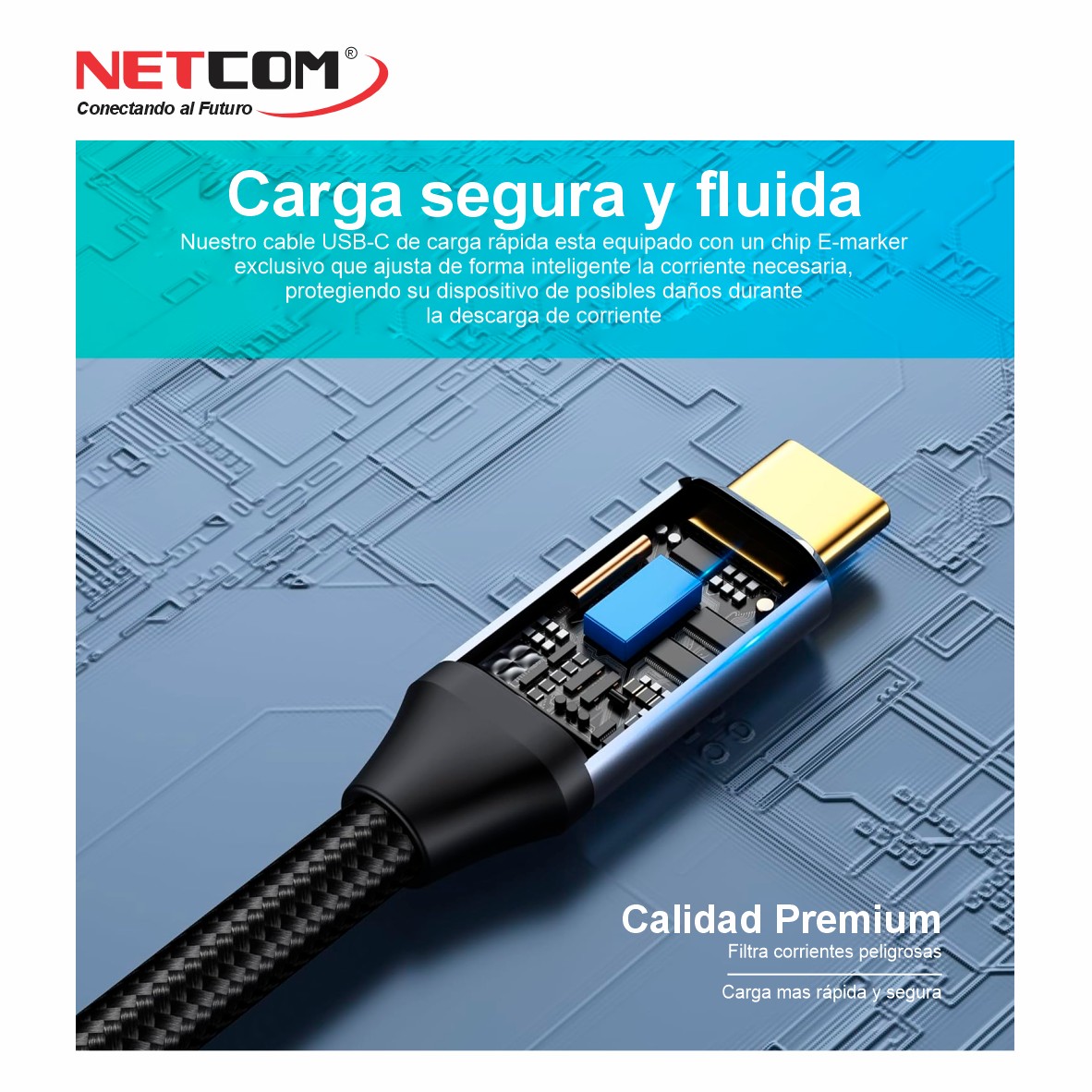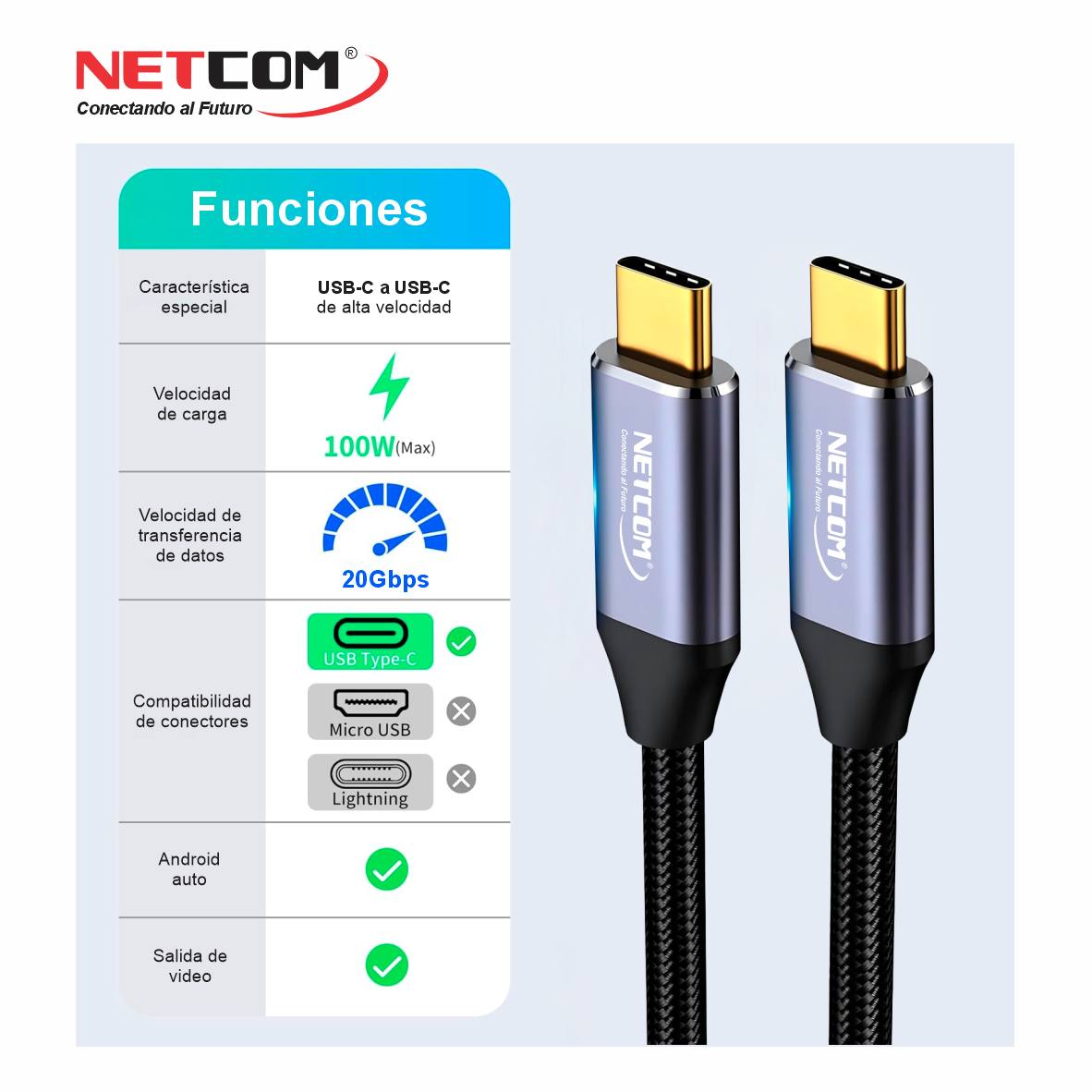 CABLE USB 3.2 TIPO C GEN2X2 A USB 3.2 TIPO C GEN2X2 DE 30 CENTIMETROS AMBOS MACHOS 20GBPS ULTRA HD 4K 60HZ PASA VIDEO Y DATOS 100WATTS CON CONECTORES DE ALUMINIO NETCOM