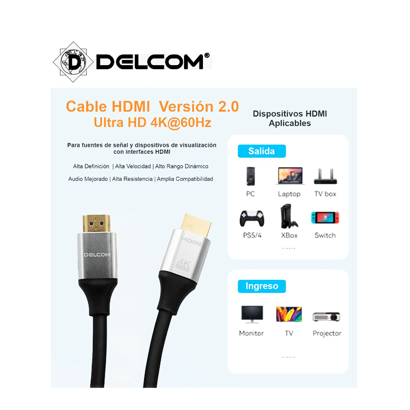 Con resoluciones más altas, mayores velocidades e imágenes más nítidas, el cable HDMI 4K x 2K – V 2.0 DELCOM, le asegura a Ud. Una experiencia de video de mejor calidad. El cable ofrece la más alta calidad HDMI disponible actualmente. Resulta perfecto para crear conexiones confiables de cine en casa o señalización digital.