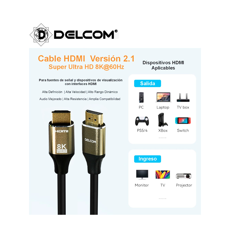 CABLE HDMI 2.1 48GBPS ULTRA HD 4K A 120HZ Y EN 8K A 60HZ DELCOM