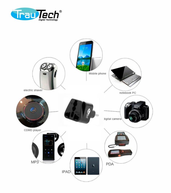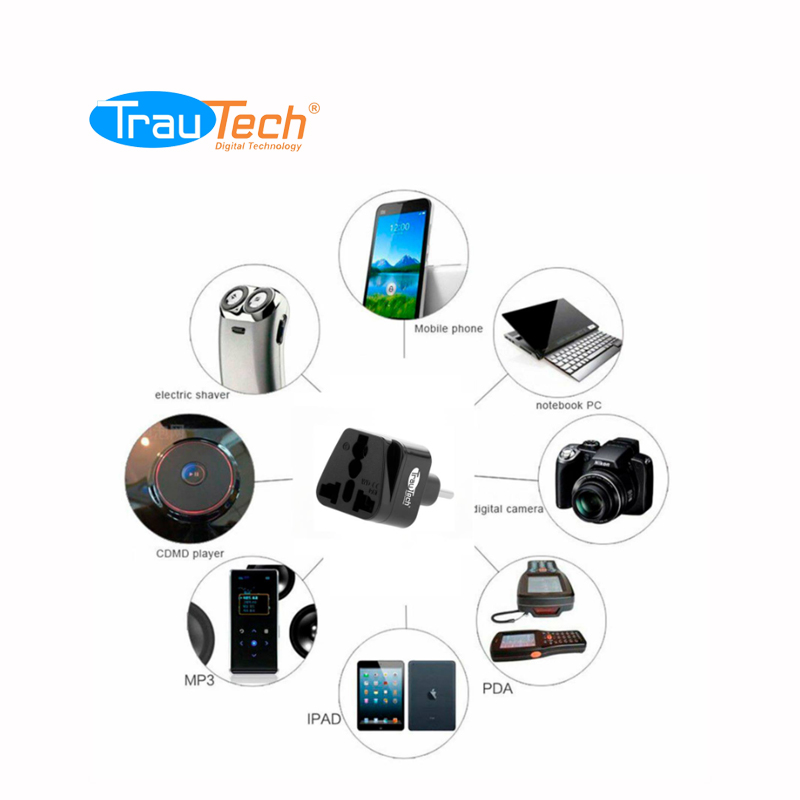 Adaptador compacto de multi-enchufe universal (hembra) a enchufe 2 clavijas redonda (macho). Útil para conectar dispositivos con diferentes clavijas en enchufes con toma redonda, siempre que el dispositivo eléctrico soporte el voltaje y frecuencias de la red eléctrica local. Ideal para adaptar aquellos periféricos informáticos que se suministran con fuentes de alimentación universales (110-240V y 50/60Hz). La clavija hembra es compatible con las clavijas USA, Japón, UK, EUR, Francia, Italia, China y Australiana.