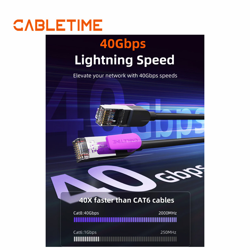 Los cables de parche CableTime Cat8 ofrecen velocidades de transferencia de datos ultra rápidas de 40 Gbps y ancho de banda de 2000MHz para transmisión perfecta, juegos y descargas. Diga adiós al búfer y el retraso y disfrute de Internet suave y de alta velocidad para todas sus actividades en línea.