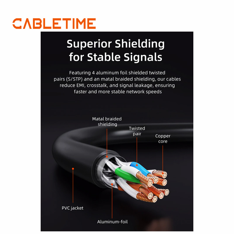 Con 4 pares retorcidos de aluminio blindado (S/STP) y blindaje trenzado de metal, este cable reduce significativamente EMI, diafonía y fuga de señal. Esto garantiza velocidades de red más rápidas y estables, incluso en entornos de alta interferencia.