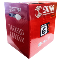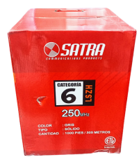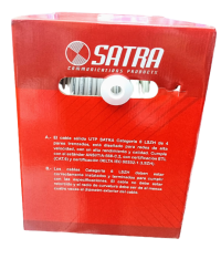 El cable sólido U/UTP SATRA Categoría 6 LSZH, resistente a la propagación del fuego, baja emisión de gases tóxicos y bajo humo contaminante, de 4 pares trenzados aislados, está diseñado para la red horizontal transmitiendo datos, voz y video en un sistema de cableado estructurado. Frecuencia de operación de 250 MHz y velocidad máxima de 1 Gigabit por segundo. Cada caja contiene un carrete con 305 m (1000 pies) de cable.