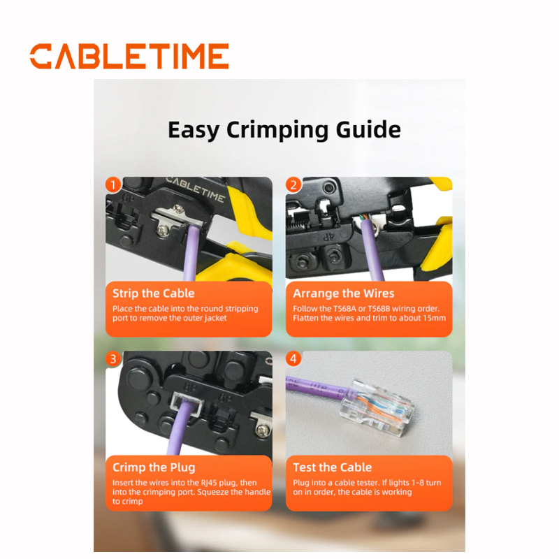 Corte, pele y crimpe cables Cat5/Cat6 con una sola herramienta. El diseño integrado ahorra tiempo, reduce el desorden y garantiza un flujo de trabajo más fluido, tanto al construir nuevos cables Ethernet como al reparar los antiguos.