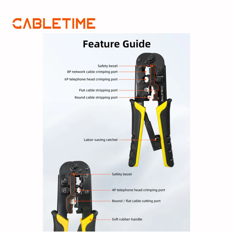 Compatible con conectores RJ45 8P8C y 6P2C/4C/6C, esta herramienta funciona con cables Cat5e, Cat6 y telefónicos. Su trinquete integrado, que facilita el trabajo, y su empuñadura de goma antideslizante la hacen cómoda para un uso prolongado, reduciendo la fatiga de las manos. Compatible con los estándares de cableado T568A y T568B, es perfecta para cables Ethernet directos o cruzados, ya sea para PC, routers, switches, concentradores o teléfonos. Fácil de usar y muy versátil, esta herramienta es imprescindible para ingenieros de redes, técnicos de TI y entusiastas del bricolaje doméstico que exigen precisión y rendimiento.