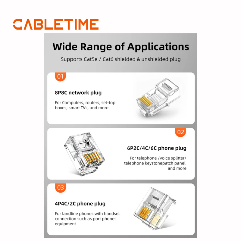Diseñada para manejar múltiples tipos de conectores, esta crimpadora funciona a la perfección con conectores de red RJ45 8P8C para Ethernet, conectores telefónicos 6P2C/4C/6C para dispositivos de telecomunicaciones y conectores 4P4C/2C para teléfonos fijos. Desde computadoras, routers y televisores inteligentes hasta teléfonos y paneles de conexión, es la solución integral para sus necesidades de red y comunicación.