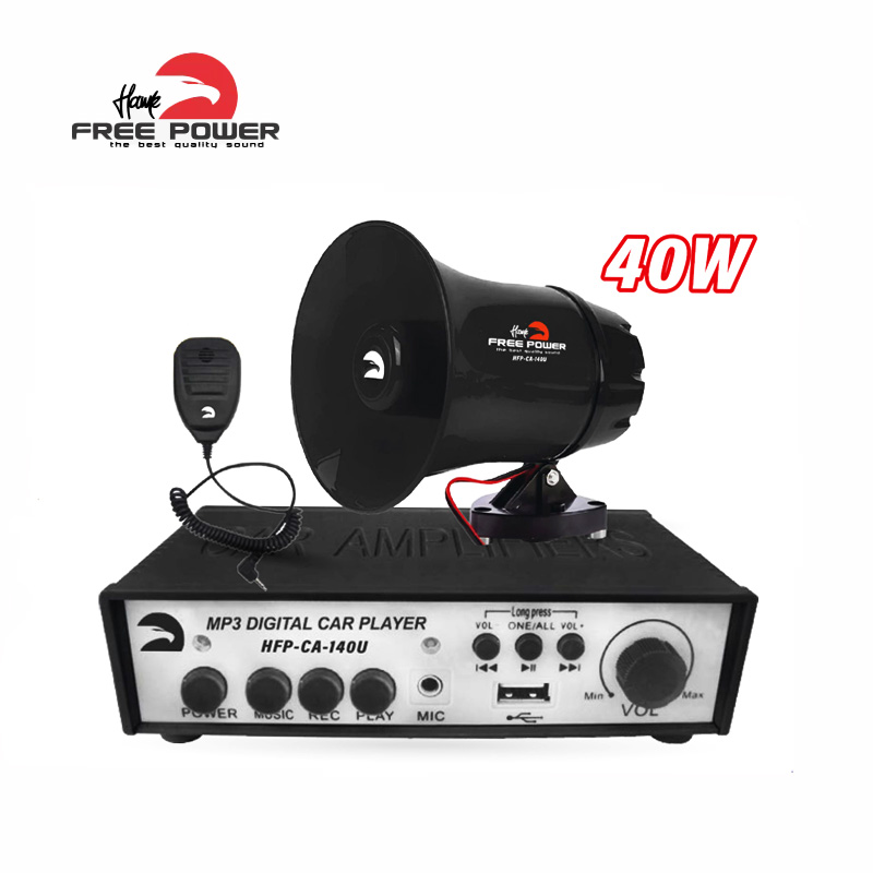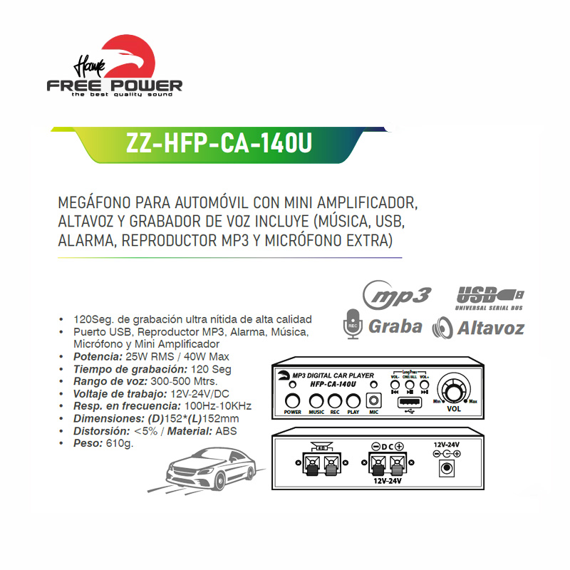 MEGAFONO PARA AUTOMOVIL CON MINI AMPLIFICADOR, ALTAVOZ Y GRABADOR DE VOZ INCLUYE MUSICA USB ALARMA REPRODUCTOR MP3 Y MICROFONO EXTRA HAWK FREE POWER